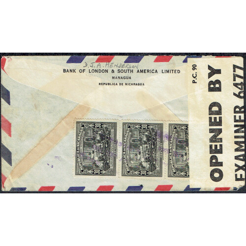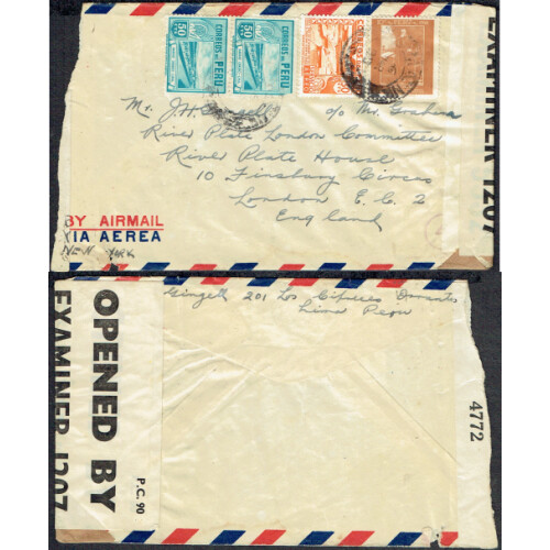 WW2 UNDERCOVER ADDRESS - Riverplate House, London. Two censor covers from Peru (roughly opened) & Nicaragua both addressed to River Plate London Committee, River Plate House, London sealed with OPENED BY EXAMINER labels. This was used as an undercover address for South American volunteers serving with British Forces in WW2. Faults. (2).
