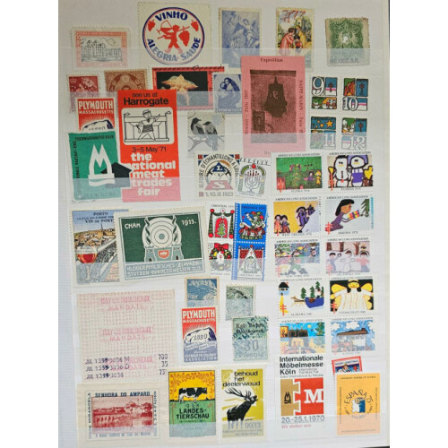 Stockbook (16 sided) with a good range of mainly all different poster stamps, advertising labels perf, imperf mainly mint, few GB Machins with P.O. Training bars, lots of different countries mainly from 1910 to modern. Approx 500+.
