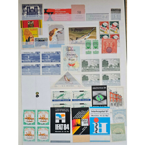 Stockbook (16 sided) with a good range of mainly all different poster stamps, advertising labels perf, imperf mainly mint, India revenues, telegraphs, 1854 crude reproduction of 4a in blk of 4 (2), few GB Machins with P.O. Training bars, lots of different countries mainly from 1910 to modern. Approx 500+.