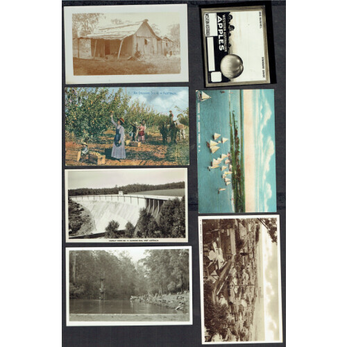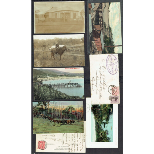 Western Australia: Attractive early group of postcards both used and unused, noted Pumping Station, Mudaring, Carting Timber, Middleton Beach, Albany, Cow girl trained as a horse, The Post Office at Morawa,1925 FREEMANTLE cancel tying GB EDVII 1d red to UK, Tucks cards incl Bunbury, Pemberton dam river pool, Wool Carting, Donny Brook, Kalgan River plus a few covers. Mixed, but intr lot (26).