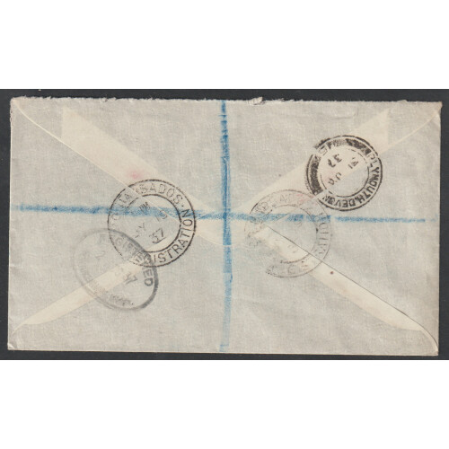 1937 (19 Jul) Registered cover to UK bearing ½d & 4d seahorse tied REGISTRATION BARBADOS d/r cds cancel with regd etiquette No. 18346.