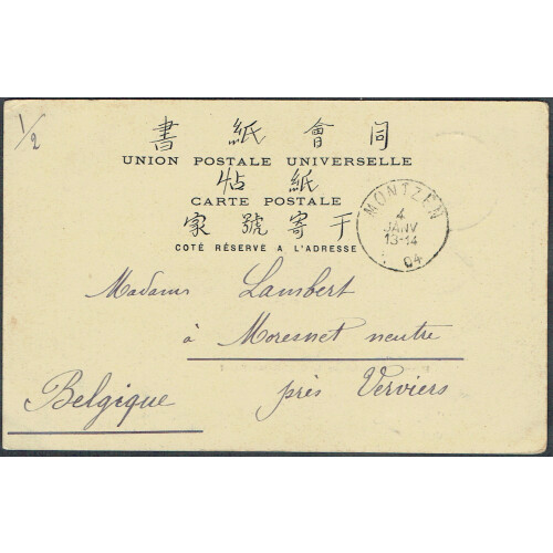 1903 Indo China Postcard of Hanoi bearing 10c tied on obverse addr to Neutral Moresnet Belgium with Montzen arrival cds, all post for the town came to and from Montzen Post Office. Scarce from Indo China.