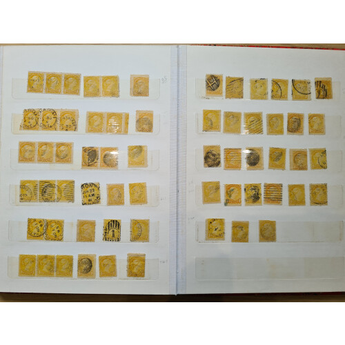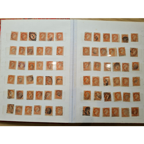 Queen Victoria Small Heads 3c vermilion dozens in a small stockbook with good range of postmarks and shades, approx 300 plus four on cover from Hamilton (One from MacAlpin Tobacco Co. with Beaver illus). 1c yellow (c40 incl shades plus 5 strips of 3, 4 pairs and on cover plus part parcel strip of 5 with 5c regd stamp tied (faults), 2c green (5), unchecked for varieties.