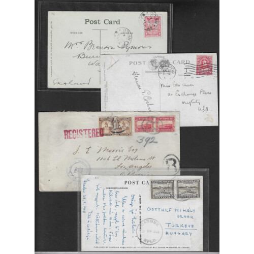 Newfoundland: Group of earlier covers including 1898 regd 3c orange & 5c violet tied SPANIARDS BAY barred ovals to Halifax, 1906 PPC of church with EDVII 2c scarlet, 1920 illustrated The Royal Stores env. with 1c green & 2c red tied St John's slogan cancel 1948 PPC og Gander Airport Terminal tied 10c salmon pair, 1934 Bowring Bros. env to USA registered St John's violet cancel, 1911 Salmon coloured PPC "Angler's Computer makes 8 out of 3" (Ayre & Sons) tied 2c red to London. Nice group.