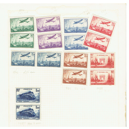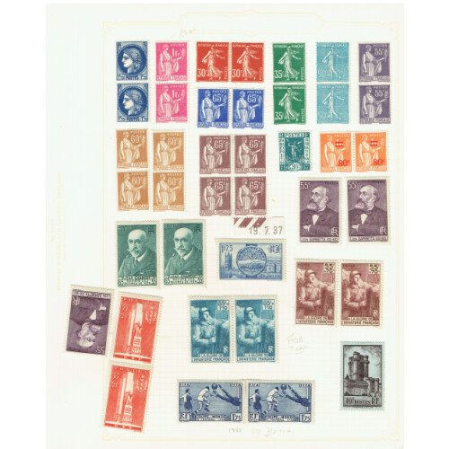 Mint collection of pairs and singles for 1930s issues some marginal coins dates, plenty of defins and commems noted 1931 10f (SG 474b, cat £95 x 2), 1936 100th Flight 10f (SG 554 Cat £500), 1936 Airs in mainly vert pairs to 3f50 (Cat £400), etc, useful group
