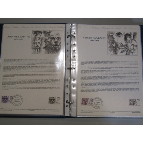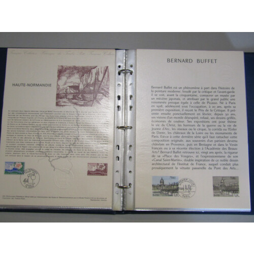 Philatelic Documents: 1976 to 1986 A large collection in seven binders containing up to 78 different A4 sized embossed special page with each stamp affixed special cancel and proof of the issue, issued by the National Printing works for 8 weeks after each issue to contribute funds for the French Postal Museum, beautiful engraved pages, listed in SG runs incomplete from 1976 to 1986, must 100s of different with catalogue values from £4 each to £10+. High original retail. 100s.