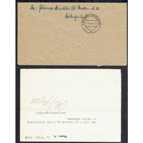 Plauen: 1946 (Jan-Mar) Two covers one multi franked with values from Arms defin set tied by Dresden cds and regd (small stain), single franking 12+8 red printed card (small tones, horiz. fold) tied PLAUEN VOGTLAND cds. Nice duo.