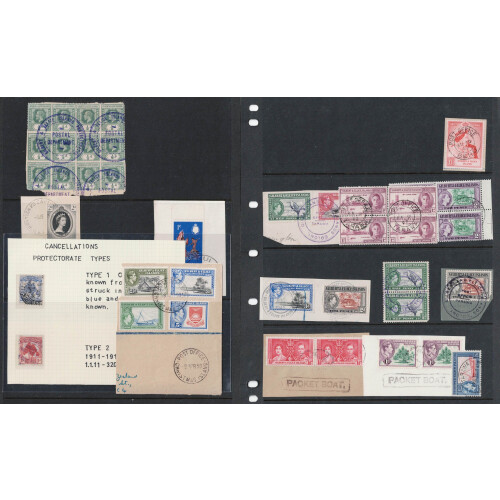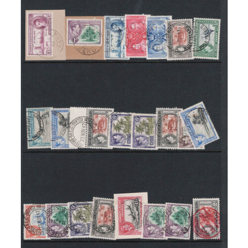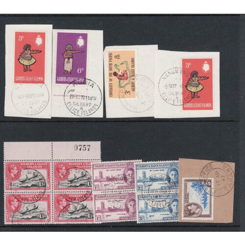 Postmarks useful assembly of mainly GVI issues each cancelled from various Islands in the Atoll including 1948 RSW £1 cancelled at BERU, on and off paper incl TARAWA, Packet Boat with crosses in oval, KURIA, TAHAW, NANUNEA, OCEAN ISLAND, NIKUNAU, CAHTON, GARDNER ISLANDS, HULL ISLAND, CHRISTMAS ISLAND (large piece with 5s, 2/6, 2½d & 3d combination), Postal Department large violet cancels on G & E I ½d green block of 12. Intr lot. (Approx. 55).