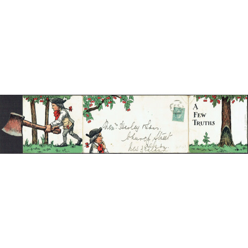1902 EDVII ½d blue-green on profusely colour illustrated fold out card (both sides) tied by FS h/s, depicting Washington felling the Cherry Tree (A Few Truths) advertising card (faults) showing the truths used to promote Johnson & Jorgenson warehouses. Faults incl creasing but very attractive and unusual.
