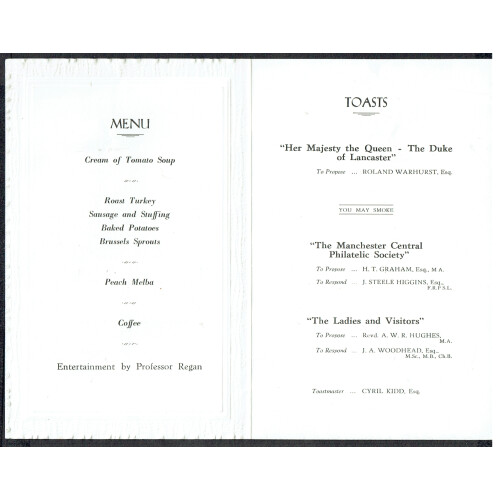1956 (10 Feb) Manchester Central P.S. Golden Jubilee Dinner card bearing EDVII ½d blue-green and QEII Wilding ½d orange both overprinted MJPS / 1906, held at The Waldorf, Manchester. Few minor bends on the card which contains the menu and toasts. Intr.