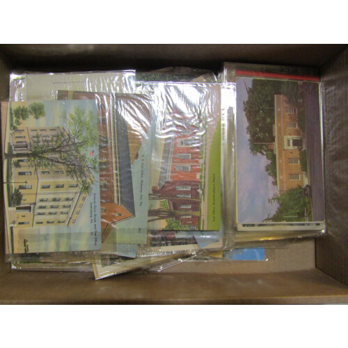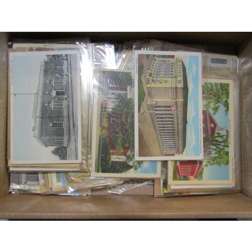 United States: Nice unused collection in a shoebox of US post office buildings from around the states, mainly coloured circa 1940s to 1950s, all in sleeves, very fine, approx. 225. High retail potential.