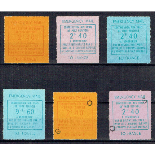 Jersey - France Strike Mail: 1971 Post Office Strike, six labels issued for mail top France unmounted mint rouletted on coloured papers for 2F40 (3 diff colours incl error), 9F60 and two overprinted C S on different 2F40 papers. Each inscribed EMERGENCY MAIL / CONTRIBUTION AUX FRAIS / DE PORT BENEVOLE... / TO FRANCE. These were produced by M Laine in Paris for mail Jersey to France. Total printing was 704 of each value from which 150 had been sold as mint, and 120 surcharged CS which were used from Jersey to Paris. The 2F40 blue on green paper is an error (only 96 examples existed), mint examples are very scarce. (6). Article accompanies.