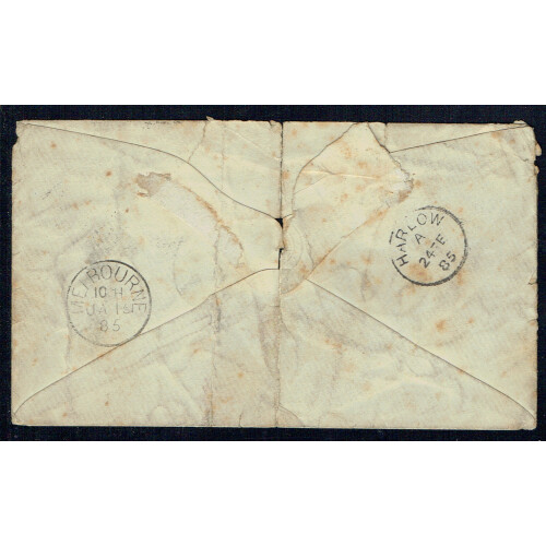 Victoria: 1885 (14 Jan) Tatty and soiled cover bearing Stamp Duty 6d ultramarine P.12½ tied HORSHAM numeral duplex addr to Harlow Essex with name cut out, sent p. P & O Mail, Melbourne and Harlow backstamps. Incredibly tatty, toned and torn but scarce postal use, SG 266 Rated £900 on cover.