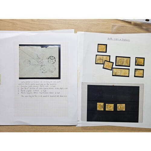 Western Australia: Mainly Swans perf issues mint and used incl duplex postmarks study written up on leaves, Perth CDS's, 1910 OHMS cover (opened out) to Lake View with UNCLAIMED & UNKNOWN BY LETTER CARRIER h/s, and DEAD LETTER OFFICE thimble in red, 1901 UP TRAIN cds from Perth, mixed but intr little lot.