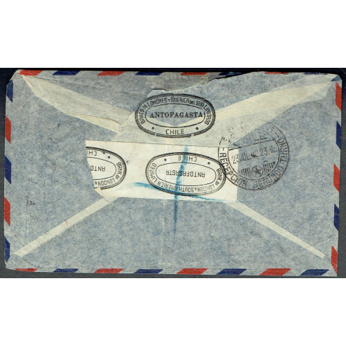 1948 (22 Jul) Registered airmail cover from Bank of London and South America Antofagasta to the same Bank in Manchester. Bearing combination of airs 10p, 5p, 2c & 5c tied ANTOFAGASTA / CERT. cds cancels and registered printed perf Bcno de Londres y / America del Sud Limitado R 610 etiquette. Fine and scarce.