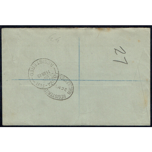 1949 (2 Mar) Registered cover (philatelic) to UK bearing GVI ½d green & 1948 RSW 2½d green pair tied single line P.O. WAINUNU / 2 - MAR 1949 struck twice over the stamps, manuscript Reg No.14, scarce cancels.