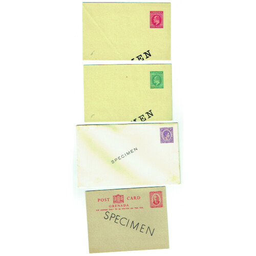 SPECIMEN Overprints on twelve items incl QV ½d green, 1d red & 1½d brown single cards, 1d red & 1½d brown newspaper wrappers, 2d grey registered P/S env., EDVII ½d green and 1d red newspaper wrappers, GV 1d red card, GVI 1d purple env., 5c purple env., 4c red single card each with SPECIMEN diagonally across the centre in black on both sides. Nice group of 12 Specimen items.
