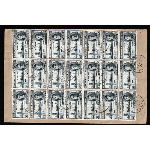 1946 Victory 30c deep blue x 22 examples affixed to philatelic cover with back block of 12 showing lamp on mast flaw (top middle stamp) each fine used 23rd Sept 1946 first day cancels, attr cover with positional variety, SG 151/151a.