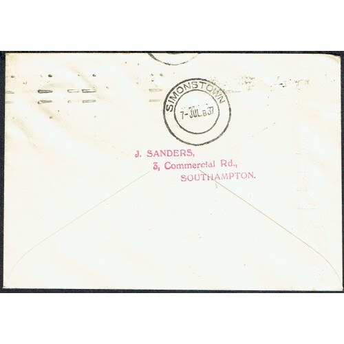 1937 First Empire Rate at 1½d: Cover from Southampton (25 June) to Simon's Town S. Africa bearing Coronation adhs tied post early slogan and printed First Empire Flight at 1½d top left in black. Printed addr.