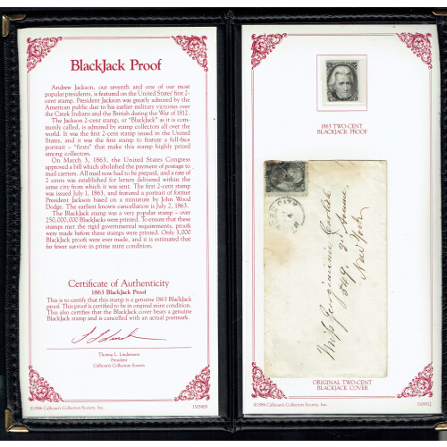 1861-67 2c black Jackson imperf proof on card (Scott 73P4a) and 2c Jackson on damaged cover in Calhoun's Collector Society folder.