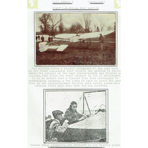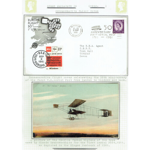 1911 First UK Aerial Post: Purple-Brown printed envelope and insert used 1d red tied special cancel, various faults and bends, plus two postcards one Farman Aeroplane in flight (colour), second postcard photo type with Radley & Bleriot Aeroplane on the ground. Nice trio written up on pages.