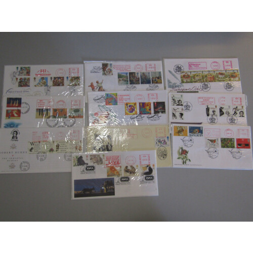 1990s Meter Mark First Day Covers for commem sets each with complete set tied special cancels and a related meter mark to each issue including 1997 1st Class booklet pane for Hong Kong with HONG KONG government office London MM, 1997 Flowers greetings with Interflora MM, 1995 60th Anniv. TV with BBC Pebble Mill MM, 1995 Time Machines MM, approx. 40 mainly different, high retail potential.