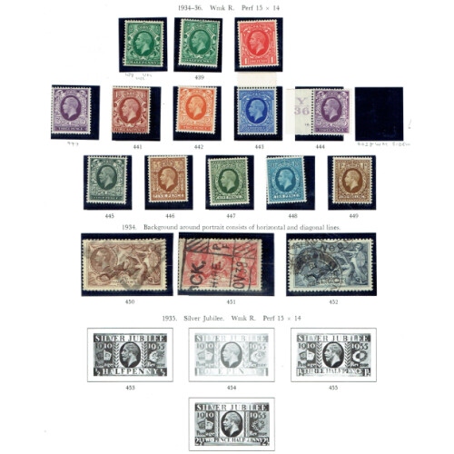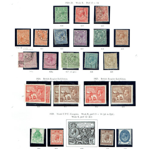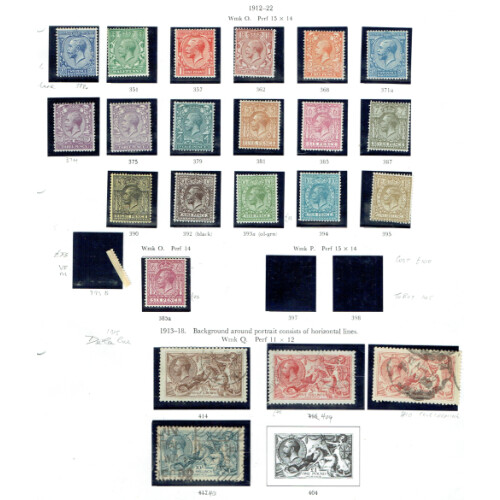 Collection on leaves with better throughout including 1912-24 set mint, 1d red S22 control blk of 6 mint, 6d-10d shades incl 6d (2), 7d (2), 8d, 9d agate, 10d mint, Seahorses 1915 DLR 2/6 sepia mint (Cat £325), 2/6 yellow-brown & deep yellow-brown used (Cat £475), 5s bright carmine f.u. (Cat £400), 10s pale blue (cat £900), 1918 10s used (2, cat £175 each), 1924 2d orange wmk sideways CDS used (Cat £100), 1934 photo. set mint, 1934 Re-engraved set used, useful cat value.