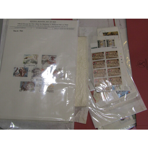 Group of revenues on duplicated sheets cancelled to order, postal history from early to modern on leaves with a variety of postmarks on P/S cards for EDVII with 037 duplexes, Douglas 407 duplex, PEEL, LAXEY, 1850 E.L with DOUGLAS dated arc in blue on reverse (Code 7), Port St Mary cds, Port Erin, 1852 RAMSEY dated arc, Crosby, 1845 IOM arc on 1d pink P/S env, CASTLETOWN small piece with double line h/s, 1882 part env redirected in IOM, Calf of Man sheets and proofs etc. intr lot. Mixed condition.