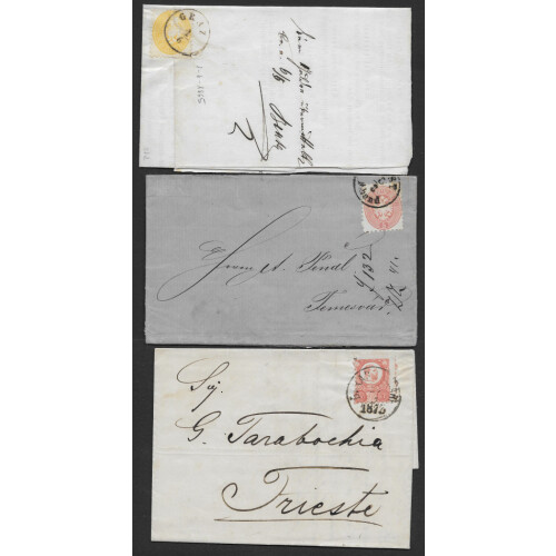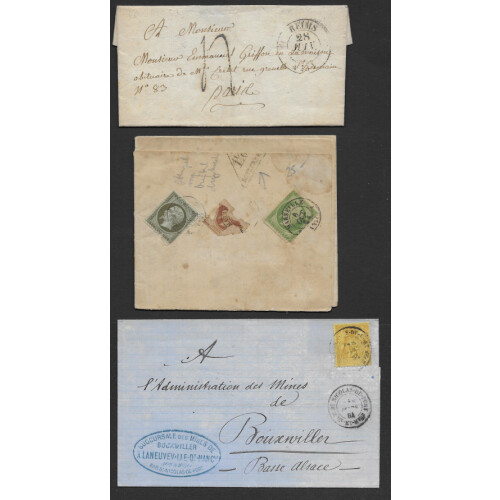France: Small group of prestamp & post stamp mail (23) from different towns and areas incl 1867 Bordeaux diamond dotted CB (Cette Bordeaux), 1841 Marseille to Lyon 6 chargemark, 1859 20c pair Sevres to Angers, 1847 Mussidan PP, 30c Ceres grey-brown pair part cover, 1854 CHERIBON FRANCEO large fancy oval in red, 1884 St Nicolas Due Port 25c ochre, 1852 Reims to Paris, 1863 Marseille Train transport per 100kg with a long list of worldwide destinations folded with triangles 1 1/6th ROTTERDAM backstamp, 1856 80c carmine-red fine large 3 margins tied diamond numeral from Toulouse with APRES / DE /DEPART boxed in black alongside, 1831 LUNEL (Commune in France) to Montepellier with 1d. h/s in red oval, 1864 Paris 22 dotted star cancel to Ypres, etc, mixed but interesting group. (23).