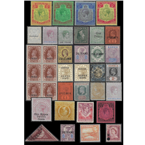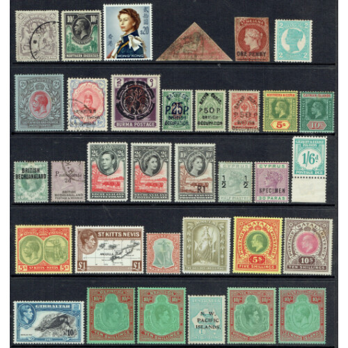 British Commonwealth collection mint and used QV to GVI in a well filled stockbook with dozens of different countries, with better EDVII/GV to 2/6 or 5s values, Rhodesia to £10, 1938 to $1 mint, N. Rhodesia GV to 10s, 1962 Annigoni set to $20 mint, Dominica, Queensland mint assembly, St Helena, East Africa GV to 2r mint, Burma Jap Occup 2r peacock ovpt (taken 'as is'), plus 1p orange used blk of 4 cnr marginal, Batum forgeries, N. Nigeria GV to 5s mint, Bechuanaland QV-QEII, Cyprus QV 30pa ovpt Specimen mint, St Lucia QV mint, St Kitts-Nevis to 5s mint, Malta, Montserrat, Nauru, Mosul, Natal EDVII 5s & 10s mint (faults), Gibraltar 1938 to 10s mint, Bermuda incl keyplates to 10s mint, Nyasaland Keyplates to 10s mint, Grenada to 10s mint, Leeward Is. GV to 10s mint, Br. Guiana GV to $1 mint, GVI to $3 mint, etc, very mixed with some tones or minor gum faults, huge cat values, 100s.