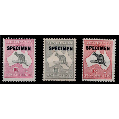 1931-36 Roos set of three high values overprinted SPECIMEN 10s, £1 & £2 hinged mint. SG 136s/138s.