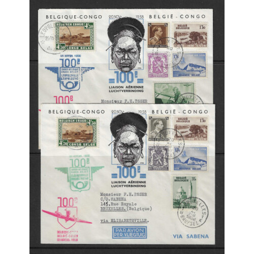 1936-38 Three Belgian Congo illustrated flight covers incl 1936 Brussels to Stanleyville then Elisabethville, 1938 Two covers with different combinations from Brussels to Leopoldville and return flight to Brussels, various cachets and arrival, departure backstamps. Attractive. (3).