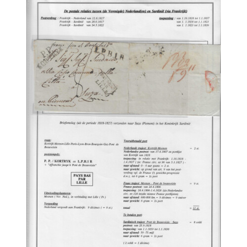 Circa 1820s (Undated) Part Entire Kortrijk (Belgium) to Suza Piemont (Italy) bearing nice strikes P.P KOTRYK two line in black, L.P.B.1.R in black, then nice PAYS-BAS / PAR / LILLE boxed three line handstamp in black and 11st manuscript chargemark, and sent via Netherlands & France, chargemark manuscript 8 soldi on arrival, neatly written up in Dutch on album page. Fine.