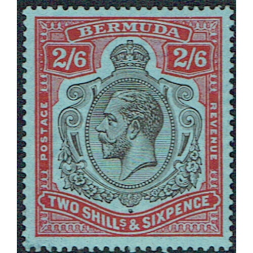 1929 2/6 black and red on blue hinged mint showing damaged bottom right leaf variety, fine. SG 89gf.