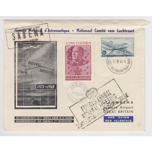 1948 SABENA 25th Anniv commemorative cover with special vignette 'A. VAN COTTHEM', pilot of the first aircraft flown by the airline and various special cachets and H/S. Nice!