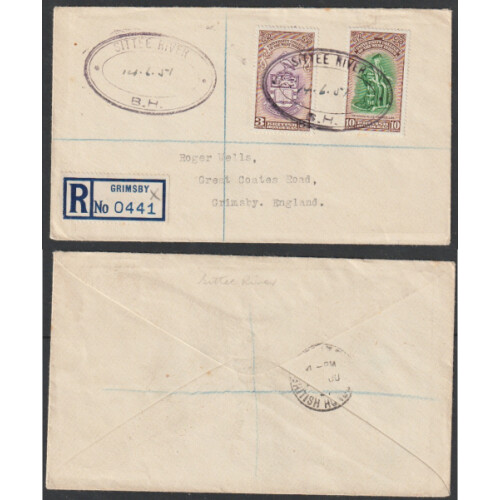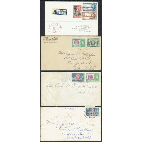 1941-53 Four GVI covers bearing various multi franked covers to USA (2), UK or Jamaica each tied rubber oval double ring datestamps for CAYE CAULKER, BENQUE VIEJO (2, one from Guatemala Consulate), BAKING POT, useful group.