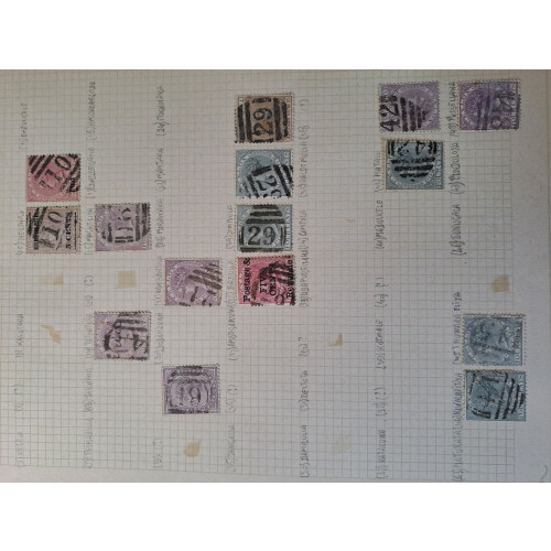 Postmarks: Collection of mainly QV issues some arranged by postmark types and few more interesting noted Duplex types for A, B, C, D, E, F including some negative types, numerals up to 96, then CDS towns and villages QV-GVI. RAF BASE violet cancels on GVI (9), QV Ceylon used in India, 1896 Telegraph small piece with 80c and 25c telegraph stamps, (approx 180).