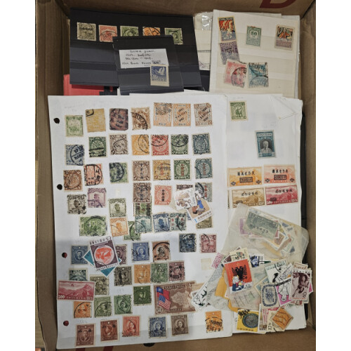 Extensive revenues duplicated collections in a well filled stockbook and postal forms in small piles includes dozens of different types noted Postal Savings, South Central Provisional ovpts, East China, Money Order with Great wall types, Famine Relief, Manchuria, Farming, Bonds, N. China revenue office, then lovely group on receipts and forms. Approx 1400+, scarce opportunity for a dealer or revenues collector.