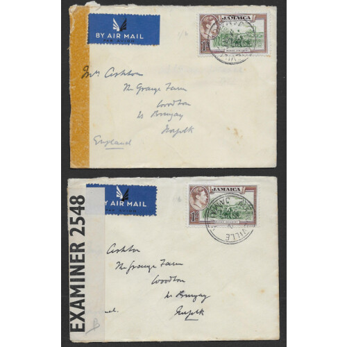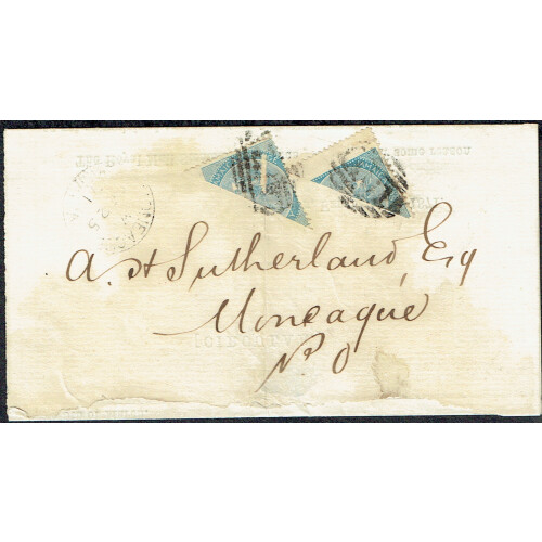 1871 (Feb 25) Printed circular from KINGSTON to Moneague bearing two 1d blue values each bisected from two different stamps tied by AO1 barred cancels and arrival part cds on obverse, headed CIRCULAR - The Royal Mail Steamer Seine, due yesterday, for some reason as yet unexplained to us, went on from St Thomas to Colon, instead of as usual coming direct here. / She took all the cargo with her, and only the Mails were brought to Jamaica by the Eider. / Our monthly Magazines and papers have in consequence not arrived, but we have received some of the late dates of the newspapers by post, which we forward to our subscribers. George Henderson & Co. Some minor faults and uneven along the top side of the printed circular. Authority for circulars with single bisects ceased on 1 Dec 1872. Unusual usage.