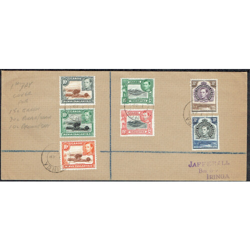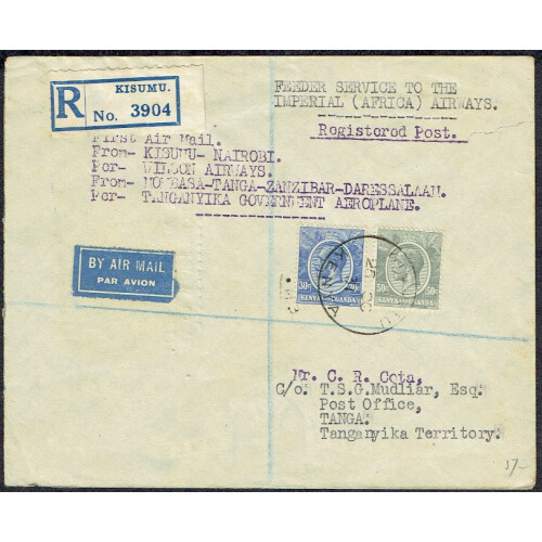 1931 (26 Oct) First Flight Kisumu - Nairobi regd airmail cover Feeder Service to the Imperial (Africa) Airways, bearing 30c & 50c tied KISUMU cds with typed flight plan from each town and city addr to Tanga in Tanganyika.