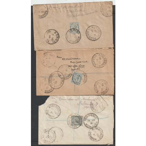 1928-31 Three commercial covers (one torn, faults) to UK each bearing 50c grey on reverse each registered from KABERAMAIDO with accompanying etiquette's on obverse. Multitude of cds cancels on reverse incl onward to MOMBASA & SOROTI UGANDA transit cds, or JINJA registered oval. Faults.