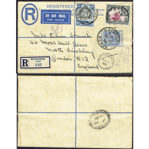 1936 (16 Jun) 50c ultramarine GV registered postal stationery envelope uprated with 30c & 50c GV tied NAIVASHA CDS cancels to London. Nairobi transit on reverse.