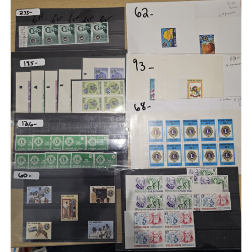 Lions Club : An extensive and attractive mint and used collection of A to Z countries as proofs, covers, stamps, singles, part sets or sets from middle to modern includes San Marino vertical strip 5 115L with doctor blade type variety, Rwanda 1967 imperf corner block of 4 set, Sanda Island in setenant pairs, Senegal Epreuve De Luxe, Togo Epreuve de luxe, imperfs blks of 4 for 1973 issue, Ivory Coast imperf blks of 4, Niger, Mali, Cuba pane of 4 with central Lions label, France, Benin, Laos, Nicaragua, Mongolia 1993 Hologram M/S, plus much more, enormous retail value from a Dutch dealer PTSA €8200+.