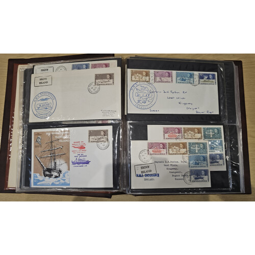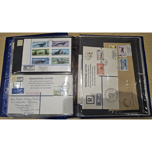 HALLEY BAY: 1975-1986 Good collection of covers on British Antarctic Territory each cover with HALLEY BAY cds cancels, noted B.A.T. commem sets and singles, plus various cacheted items for Caird Coast, boxed HALLEY BAY, Research Ship Bransfield, RRS Jogn Briscoe, registered postal stationery envelopes FEE 40p uprated to UK, OHMS env, 1983 multi signed PPC of sunset over the base etc, intr lot. (c32).