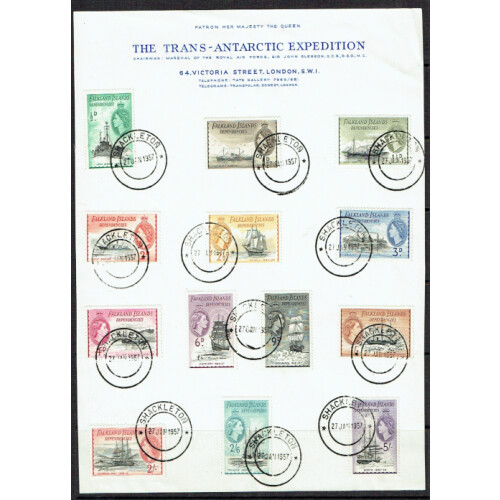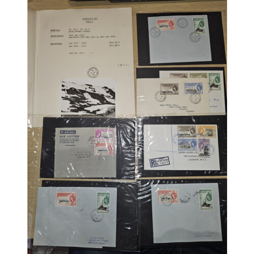 ISLAND BASES: 1950s-1970s Good collection of covers written up on leaves some with photos or pictures of the bases, the dates in use and handstamps used plus dates evacuated, noted ADMIRALTY BAY BASE G (5), DANCO ISLAND / BSE O (4), ANVERS ISLAND BASE N (3), PROSPECT POINT BASE J (2), MARGUERITE BAY BASE E incl STONINGTON ISLAND (5), HOPE BAY (8), PORT LOCKROY BASE A (5), HORSESHOE ISLAND BASE Y (4), LOUBET COAST BASE W (4), intr lot. (c40).
