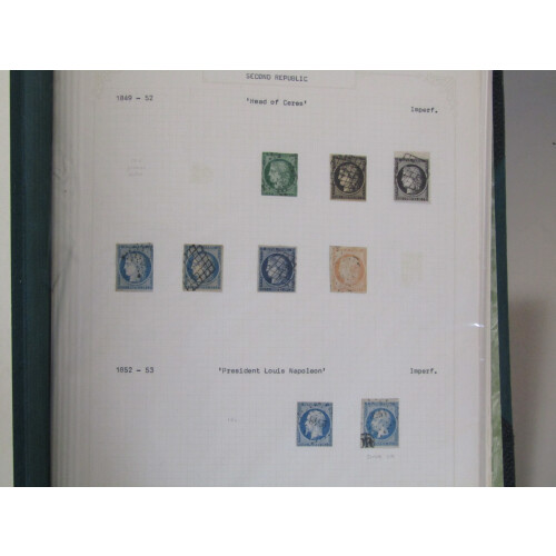 1849-1962 Definitives collection in a Simplex deluxe springback album with most printings represented for 19th century including 1849 15c green (no margins, neatly cat £1200), 40c orange (3 margins), 1853 1c to 80c (mostly f.u. copies), 1862 perf to 80c, 1863 to 80c, 1869 5fr grey-lilac heavy used (faults, cat £1200), 1870 Bordeaux 1c olive on greenish mint, 10c bistre, 30c, 40c & 80c, (faults), 1871-76 four values, 1876 Peace & Commerce incl both greens low values used, 1940-41 surch set 18 mint etc. Approx 650+. Huge cat value.