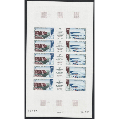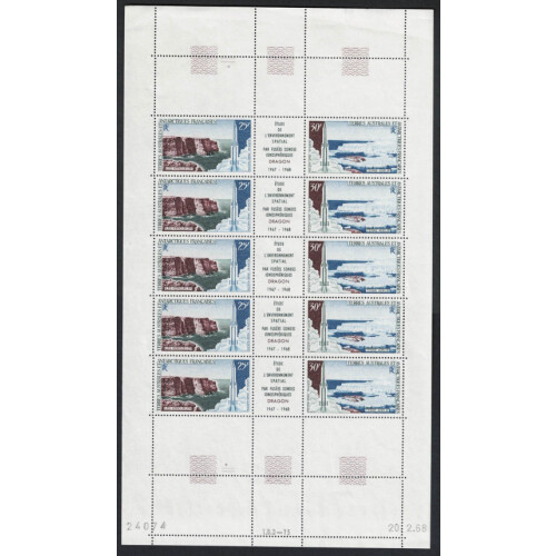 French & Southern Antarctic Terr: 1965 (16 Jan) Philatelic larger cover (vertical bend not affecting the stamps) bearing a multitude of better stamps tied by TERRE ADELIE T.A.A.F cds cancels, noted 1956-60 85f (Cat £65), 4f (Cat £55), 8f (cat £70), 10f, 12f (Cat £65), 15f, 20f (cat £65), 25f (Cat £160), 100f & 200f airs (Cat £165), 1960 Kerguelen 25f (Cat £65), 1962 50f air (SG 34 cat £110), 1961 Charcot (Cat £65), 1963 Crozet 5f (Cat £90), 1963 Quiet sun set 2 (Cat £215), 24 stamps Cat £1295. Attractive and unique.