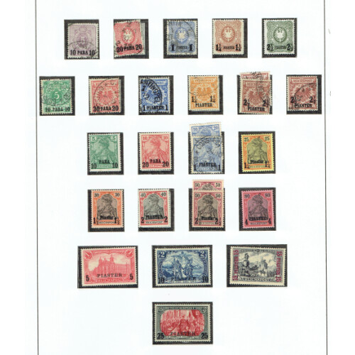 Turkey: 1884-1912 Collection on three album pages mint & used including 1884 Germany ovpt set of 5 (€430) m & u (2½PIA on 50pf is unused and signed Stolow on reverse, 1889 Germany surcharge set of six used, 1900-04 set to 25pi on 5m mint (€450), 1902-04 Overprint type II set of five used to 5pi on 1m, mint 10pi on 2m & 25pi on 5m (€625), 1905 set to 15pi on 3m mainly mint (€750), 1905-13 set to 25pi , 1908 Centimes set 5. Neatly arranged on printed SAFE hingeless page. (71). Huge cat value.