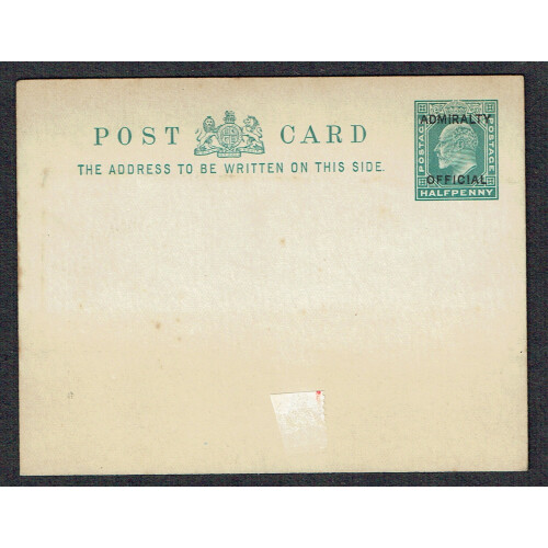 Admiralty Official: 1904 EDVII ½d green postal stationery card overprint ADMIRALTY / OFFICIAL, unused with odd tone spot, seldom seen. O42c.
