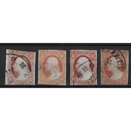 1851-57 Type I & II 3c values for Scott # 10, 10A, 11 & 11A fine used mainly with two margins Scott #10 cut into along top, other cut with two margins, CDS used nice examples, Cat $350.